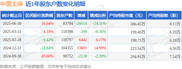 从股价来看,2025年3月31日至2025年6月30日,中国太保区间涨幅为16.64%,在此期间股东户数减少2.66万户,减幅为24.11%。
